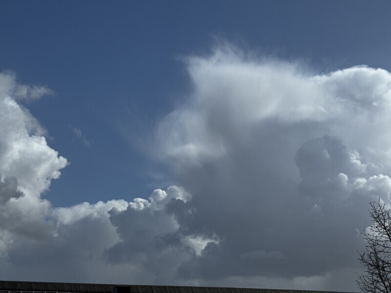 IJskristallen waaieren flink uit, rechts een wolkentoren in de vorm van een cumulus congestus die spoedig ook deel gaat uitmaken van de bui en regen zal gaan produceren of winterhagel.