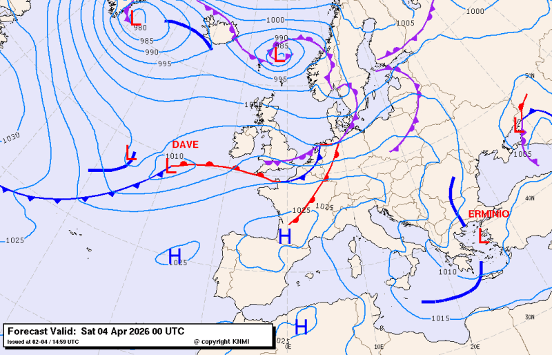 Depressies zijn voorlopig aan zet maar tussen depressies in zit altijd een rug van hogedruk. Ook dit keer en overdag zaterdag trekt deze ons land over. Ten zuidwesten van Engeland ligt een depressie met de naam Dave. Dit lagedrukgebied gaat fors uitdiepen (de druk in de kern gaat flink naar beneden) en zal Ierland en Schotland gaan voorzien van stormwinden, vandaar de naamgeving. Wij hebben te maken met enkele zwakke frontjes.