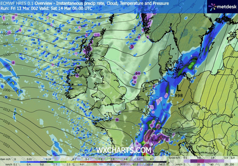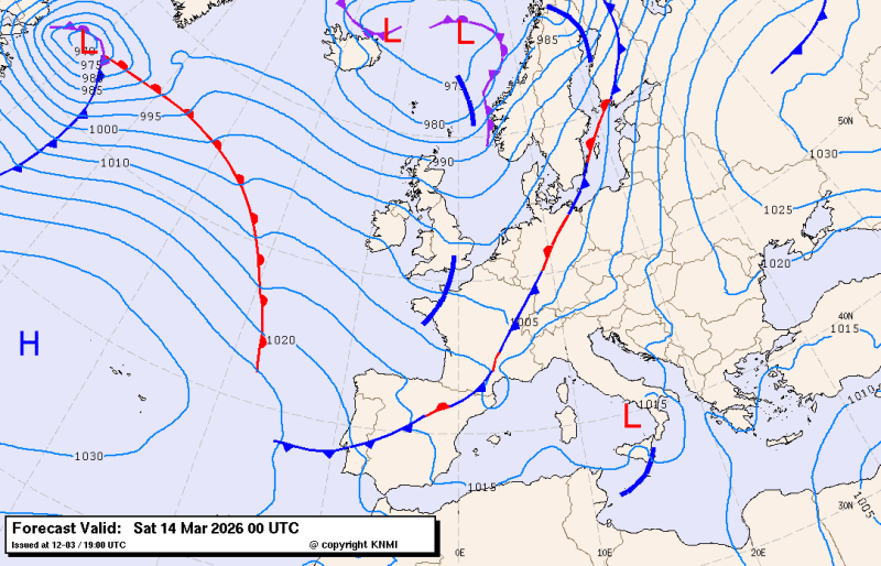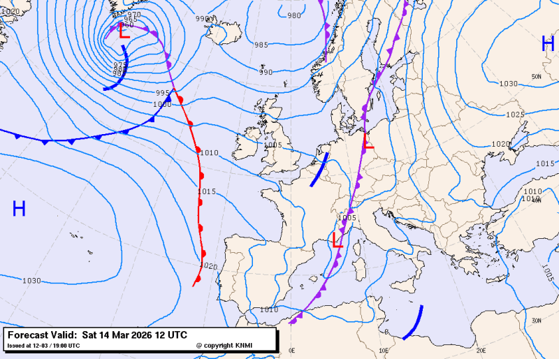Animatie ECMWF model voor de zaterdag van 07 uur t/m zondag 01 uur NL tijd.