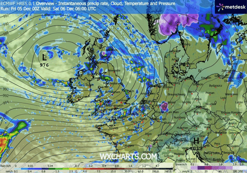 Half tot zwaar bewolkt en regelmatig buien die het land overtrekken met een redelijke snelheid. De kans op onweer is niet zo groot maar lokaal is een ontlading mogelijk. Opvallend is dat achter de occlusie zachtere lucht vanaf de oceaan het land binnentrekt met overdag 8-12 graden.