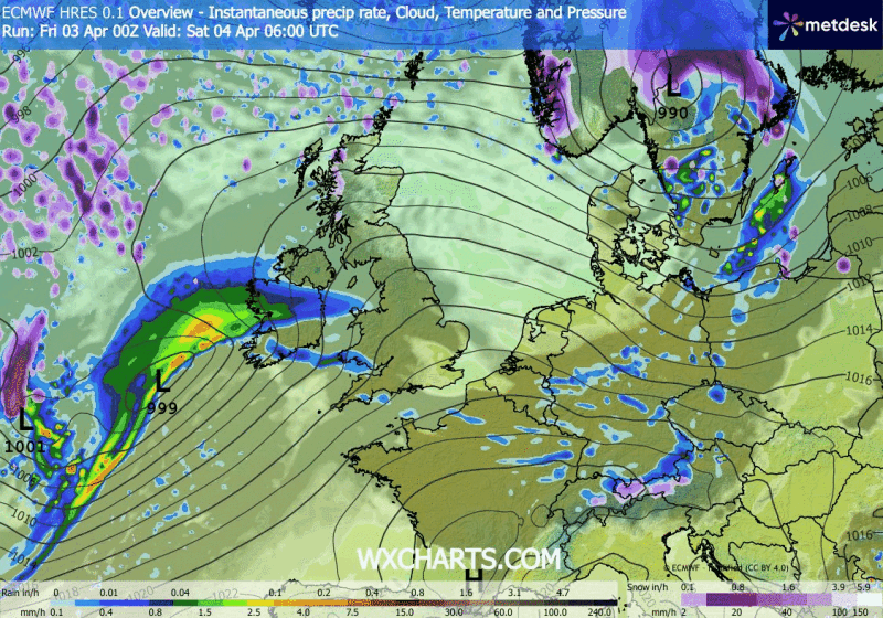 Animatie ECMWF model voor de zaterdag van 08 uur t/m zondag 02 uur NL tijd.